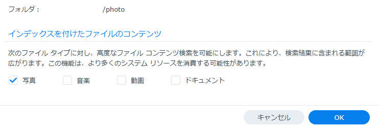 * ユーザー定義の「インデックス付きフォルダリスト」 で /photo を編集し、「写真」 にチェックを入れる。