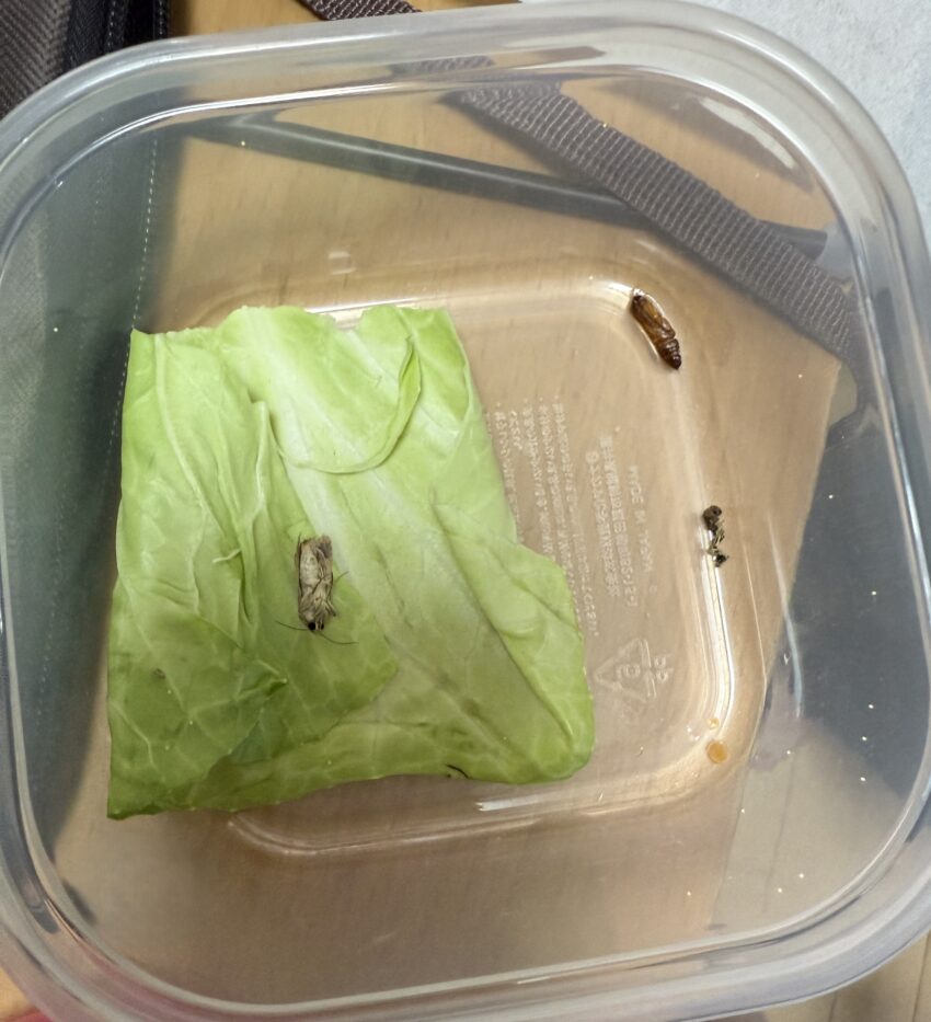 我が家のタッパーの中で完結した、小さな一生。右上のサナギから、キャベツの上の成虫へ。数字では測れない時間がそこにありました。